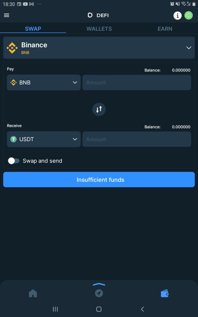 Looking at the interface of the Dopamine wallet, it is fairly slick and inviting but at the same time lacks a certain something. It is most likely due to it being more of a DeFi focused wallet, rather than a multi-coin wallet. There are non-custodial wallets for Bitcoin, Ethereum and others. There is a built-in DEX, swap engine, which keeps your trades in-house. This is always a great addition to any mobile wallet.