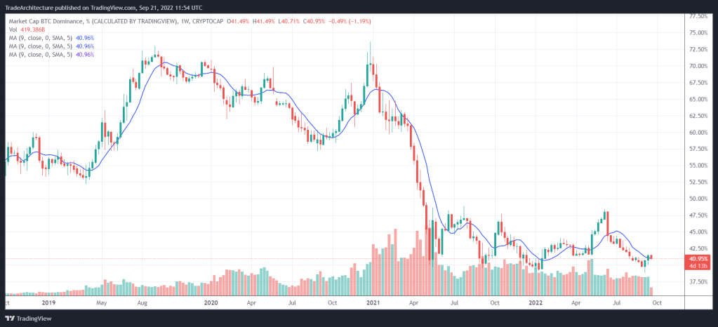 Bitcoin dominance is often utilized, especially by traders looking to discern the next altcoin season or rally. It has been a fairly good indicator over the years and still holds incredible importance when it comes to navigating the altcoin market. If you are one of my more regular readers, you will be aware of my “rule” when it comes to indicators: Never use a single indicator in isolation. I am a firm believer in finding confluence. In other words, finding multiple indicators that are pointing in the same direction. Confluence decides direction, just as volume moves and sustains market moves. Below is the current chart for the Bitcoin dominance, which reveals that the dominance for BTC has been ranging between 39% and 47% for the past seven months or so.
