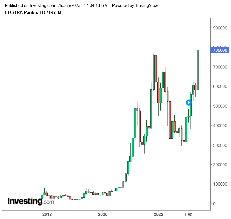 However, I am not going to get into that now. What we are, however, going to be looking at is national fiat currencies and their performance against BTC. One of the most interesting is the Turkish lira. The lira has lost significant value against the dollar and, subsequently, Bitcoin. The devaluation of the Lira has consequently caused the price of BTC to skyrocket against the Turkish lira. BTC is on the brink of printing new highs against the lira.