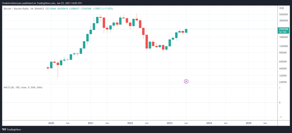The screenshot above clearly depicts Bitcoin’s ascent against the lira. This just goes to show how important saving in BTC is. Remember, saving or investing is a long-term endeavor. Weekly and monthly movements are noise, especially in times of uncertainty. Another national fiat currency that is losing ground against BTC is the Russian ruble. Taking a look at the screenshot below, it is evident that BTC is approaching all-time high levels against the ruble. It’s not as impressive as the lira against BTC, but it’s moving in the right direction.