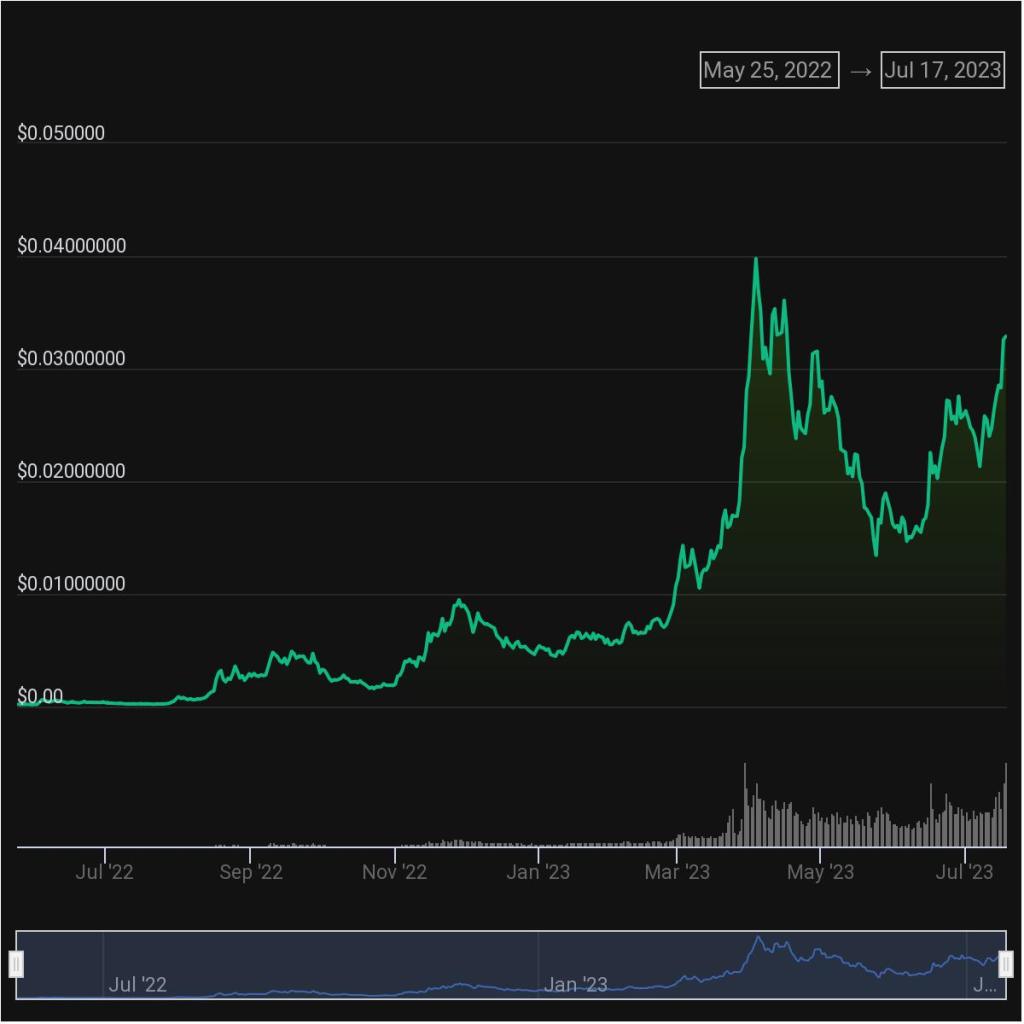 The maximum supply of KAS is 28.7 billion with a current circulating supply of 19.69 billion. The market cap is still relatively modest at $634 million, which isn’t much for a layer 1 blockchain. Kaspa was launched in November of 2021 and is likely one of the only coins to be at a higher valuation now than at the peak of the bull market. Take a look at the screenshot below, it reveals an enormous surge post-November 2021.